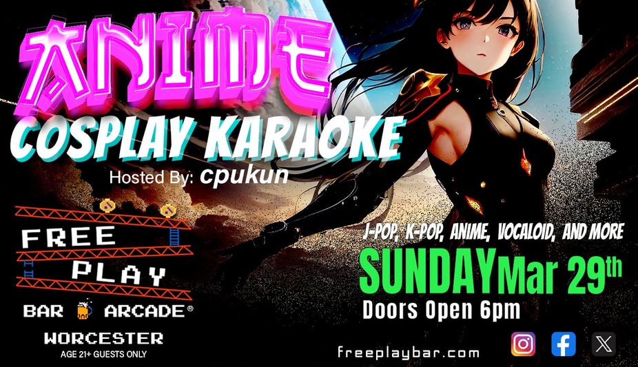 Anime Cosplay Night is back at Freeplay Worcester - Sunday February 22nd! Come join us for a night of games, drinks, anime, and karaoke! That's right - Karaoke featuring Anime, J-Pop, K-Pop, Vocaloid, and more has been added to this incredible event! Enjoy some delicious cocktails and pizza, show off your best cosplay, and sing your favorite karaoke hits! Doors open at 6PM and you must be Age 21 or older to attend this event.