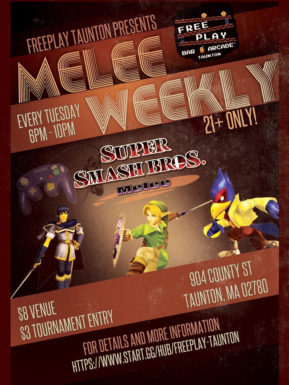 Super Smash Brothers Melee every Tuesday night at Freeplay Taunton! Doors open at 5PM and Melee starts at 6PM. See you Tuesday nights @ Freeplay Taunton!