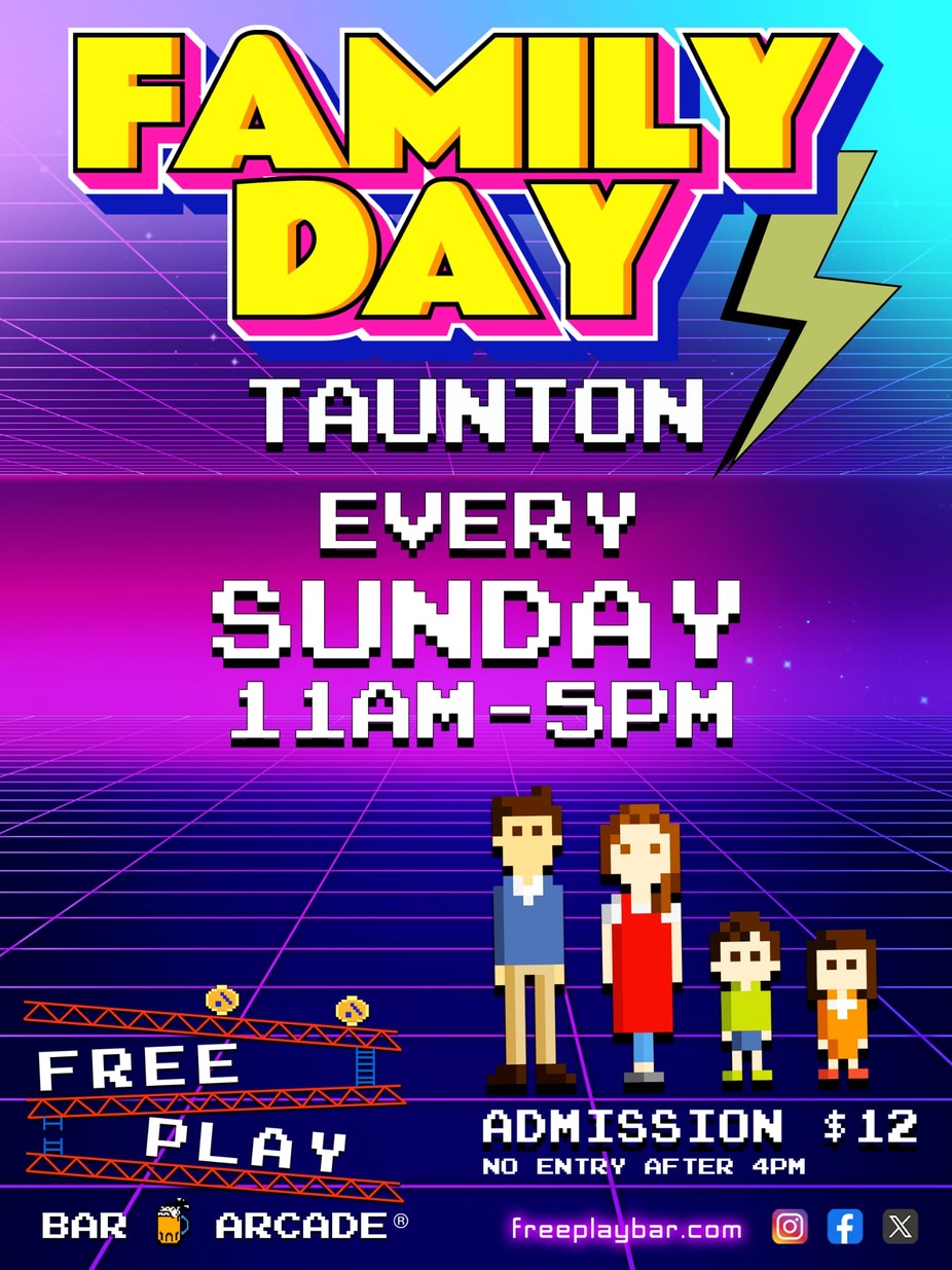 Taunton Freeplay Family Day is held EVERY SUNDAY!! Bring the kiddos and enjoy all the arcade games, skee ball, air hockey, and pinball together! Admission is just $12 per person and all games are set to free! Fun for the whole family! Please note, no entry after 4PM. Every Sunday Family Day is held at the Taunton location ONLY.