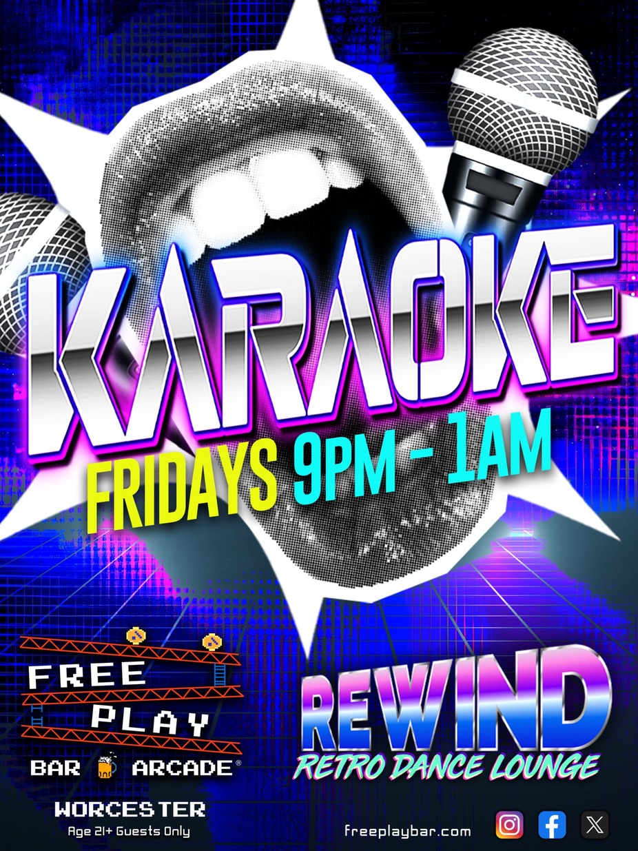 Join us for Karaoke every Friday Night starting at 9PM in the Rewind Retro Dance Lounge at Freeplay Bar Arcade Worcester!