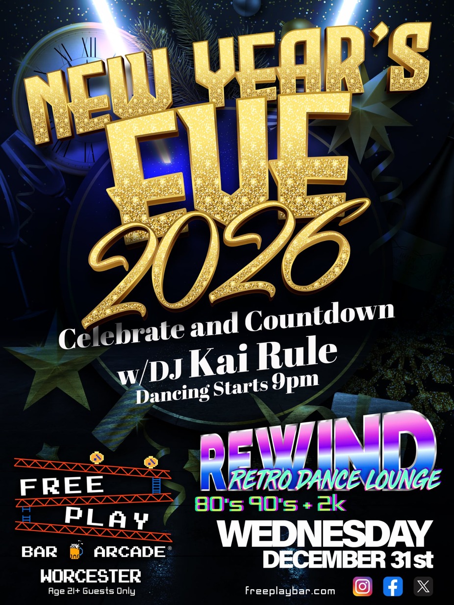 GAME OVER 2025! Let's Ring in 2026 at Freeplay Worcester! Come celebrate the New Year and enjoy over 100 Arcade Games, Pinball, Skee Ball, Air Hockey, and DDR! Plus DJ Kai Rule will be spinning all of your favorite hits from the 80s, 90s, and 2K in The Rewind Retro Dance Lounge! Freeplay doors open at 5PM, Rewind opens at 9PM, Admission = $12. Start your 2026 New Year off right @ Freeplay Worcester!