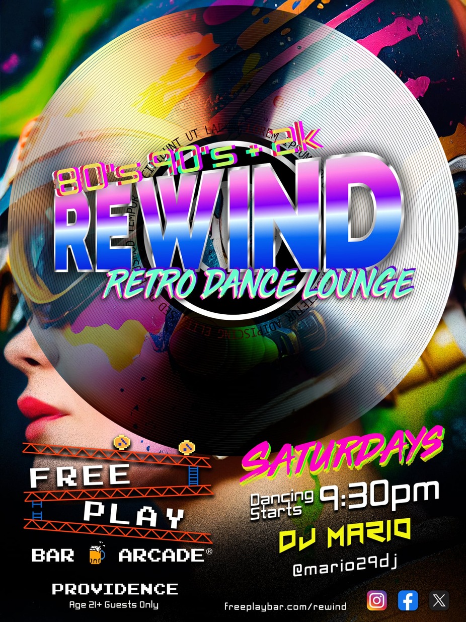 Dance to all of your favorite hits of the 80s, 90s and 2K with DJ Mario every Saturday Night! Dancing starts at 9PM in the Rewind Retro Dance Lounge at Freeplay Bar Arcade Providence!