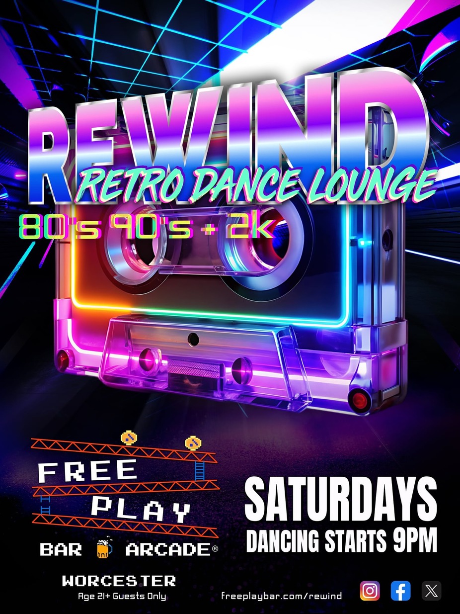 Dance to all of your favorite hits of the 80s, 90s and 2K every Saturday Night in the Rewind Retro Dance Lounge at Freeplay Bar Arcade Worcester!