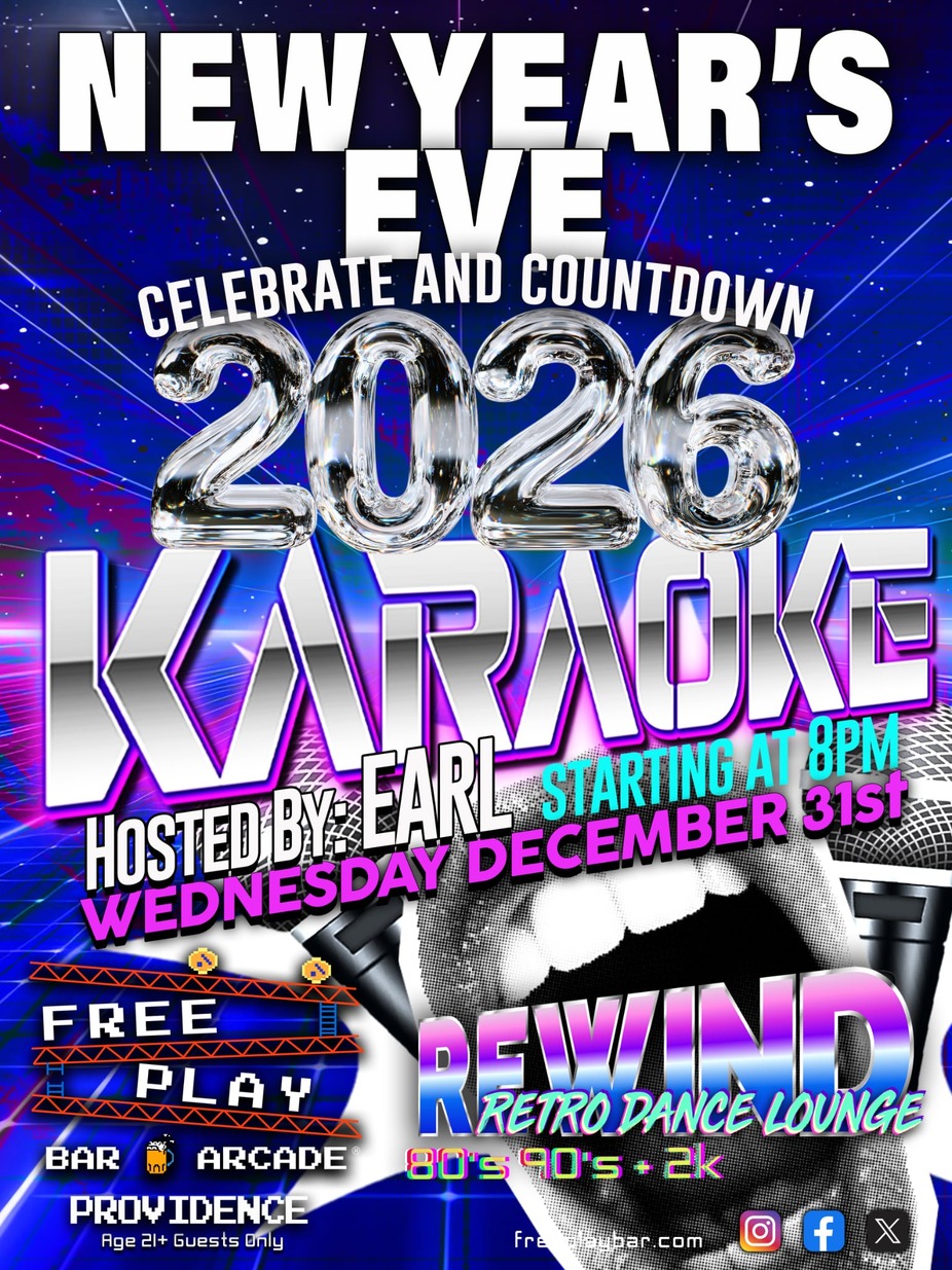 GAME OVER 2025! Let's Ring in 2026 at Freeplay Providence! Come celebrate the New Year and enjoy over 150 Arcade Games, Pinball, Skee Ball, Air Hockey, and DDR! Plus Earl will be hosting karaoke upstairs in the Rewind Retro Dance Lounge! Freeplay doors open at 5PM, Karaoke starts at 8PM, Admission = $12. Start your 2026 New Year off right @ Freeplay Providence!