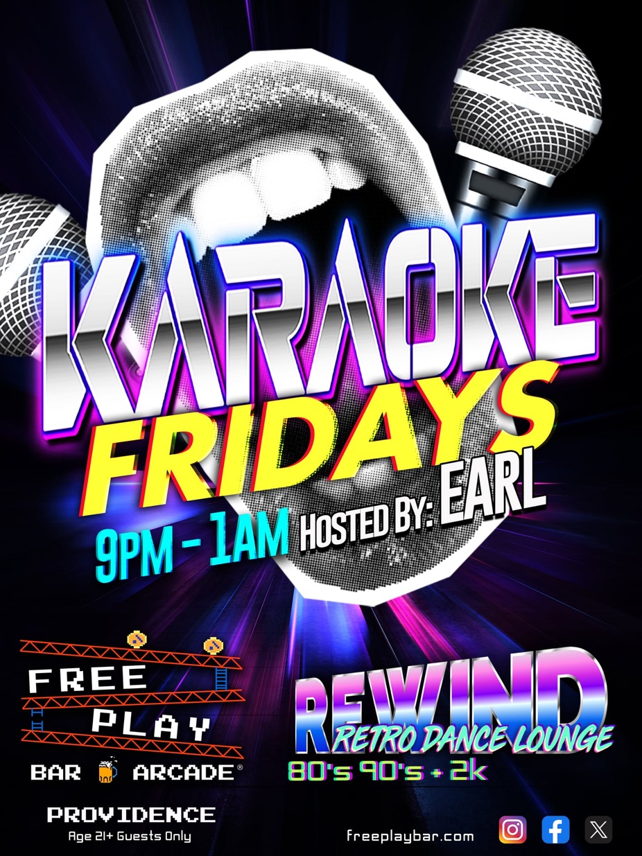 Join us for Karaoke hosted by Earl every Friday Night! The karaoke funs starts at 9PM in the Rewind Retro Dance Lounge at Freeplay Bar Arcade Providence!